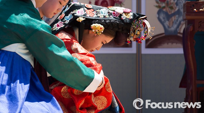 (서울=포커스뉴스) 7일 오전 서울 구로구 궁동저수지생태공원에서 '정선옹주 시집가는 날' 참가자들이 전통혼례를 재현하고 있다. 정선옹주는 조선 14대 임금인 선조와 후궁 정빈 민씨의 딸이다.