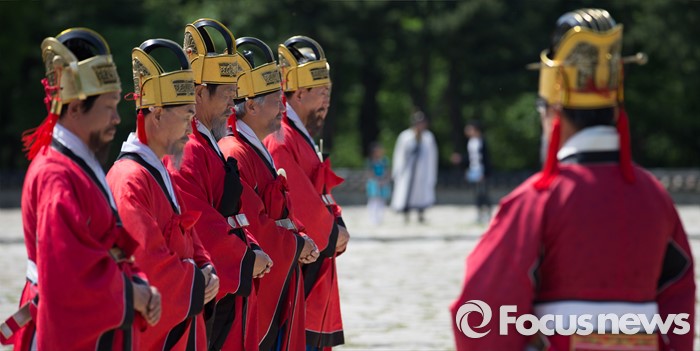 (서울=포커스뉴스) 7일 오후 서울 종묘 정전에서 열린 '조선의 세자빈 혼례를 고하다' 행사에서 참가자들이 묘현례를 재현하고 있다. 묘현례는 왕비나 세자빈이 왕실 혼례를 마친 후 조선왕조 역대 왕가 왕비의 신주가 모셔진 종묘를 알현하는 의례로서 조선시대 종묘에서 행해지는 국가의례 중 왕실 여성이 참여하는 유일한 행사이다.