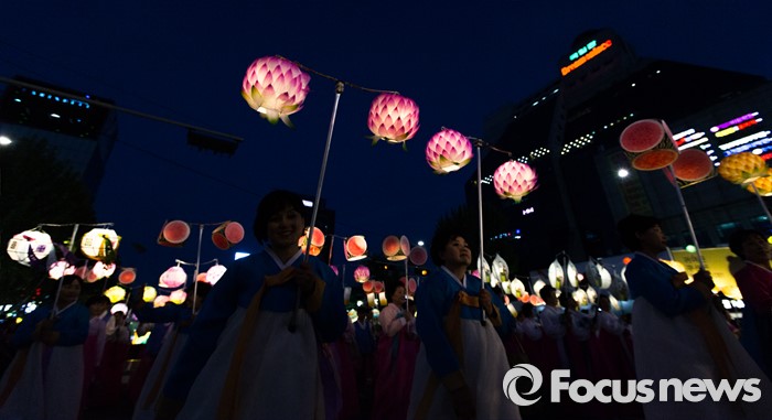 (서울=포커스뉴스) 부처님 오신날을 일주일 앞둔 7일 오후 서울 종로구 흥인지문부터 시작해 조계사까지 이어지는 화려한 연등 행렬이 펼쳐지고 있다.