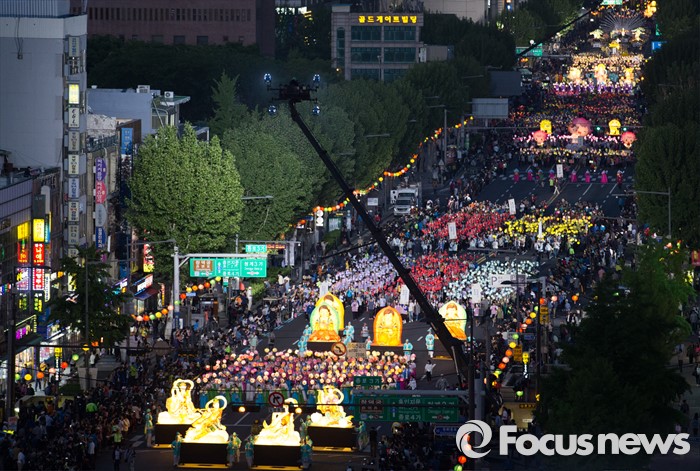 (서울=포커스뉴스) 부처님 오신날을 일주일 앞둔 7일 오후 서울 종로구 흥인지문부터 시작해 조계사까지 이어지는 화려한 연등 행렬이 펼쳐지고 있다.