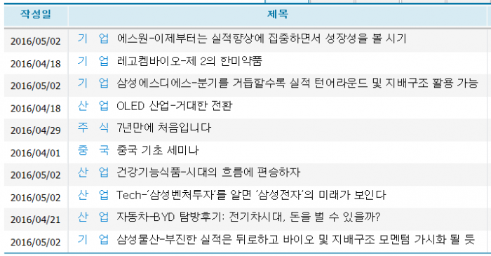 자동차주는 자동차시장 중심인 RV와 전기차 관련주인 기아차와 엔에스가 러브콜을 받았다.지난 한주간(5월2일~8일) 증시 투자자들은 철강소재관련 리포트와 향후 성장성 가능한 실적주를 찾았다(자료제공=에프앤가이드)연휴 전 POSCO 주가는 4% 넘게 하락했다(차트제공=네이버금융)에스원 주가는 연휴 전일 10만원을 돌파했다(차트제공=네이버금융)삼성벤처투자의 지난 2015년 이후 지분투자 기업들(자료출처=에프앤가이드, BNK투자증권)이번 주(5월8일~14일) 증권사 코스피 추천주(자료제공=각 증권사)아모레퍼시픽 주가의 3개월간 주가흐름(차트제공=네이버금융)이번 주(5월8일~14일) 증권사 코스닥 추천주(자료제공=각 증권사)