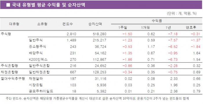 배당주식펀드와 일반주식펀드도 각각 1.35%, 1.23% 떨어진 것으로 나타났다.