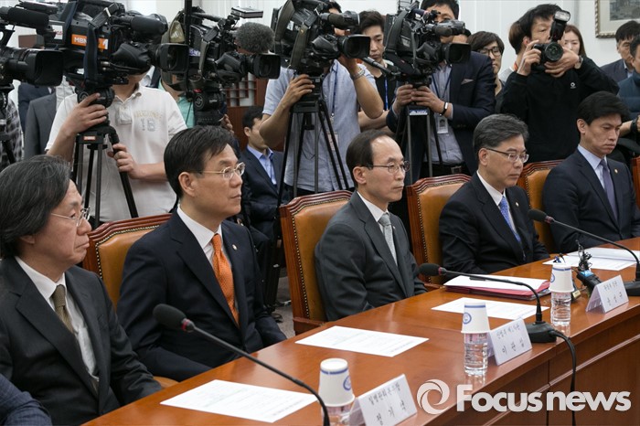 (서울=포커스뉴스) 8일 오후 서울 여의도 국회에서 가습기살균제 피해 대책 당정협의에 정부 측 대표단이 자리에 앉아 있다.왼쪽부터 정기석 질병관리본부장, 이관섭 산업부 1차관, 윤성규 환경부 장관, 송언석 기재부 2차관, 손문기 식약처장.