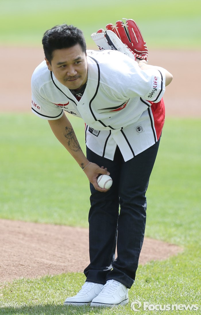 (서울=포커스뉴스) 8일 수원 kt위즈파크에서 열린 2016프로야구 한화-kt 경기에 앞서 가수 JK 김동욱이 시구하며 포수의 사인을 보고 있다.
