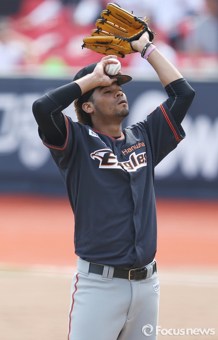 (서울=포커스뉴스) 8일 수원 kt위즈파크에서 열린 2016프로야구 한화-kt 경기에서 한화 투수 로저스가 6회 1사후 kt 박기혁에게 2루타를 맞은후 모자를 고쳐 쓰고 있다.