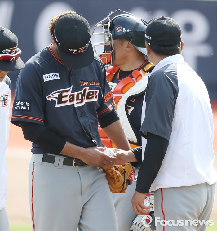 | △ 교체돼 마운드 내려가는 한화 로저스 |