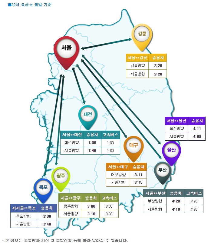 주요도시에서 서울까지 소요되는 시간은 오후 9시 기준 강릉 2시간 20분, 부산 4시간 10분, 광주 3시간 10분, 목포 3시간 40분, 대전 1시간 40분 등이다.