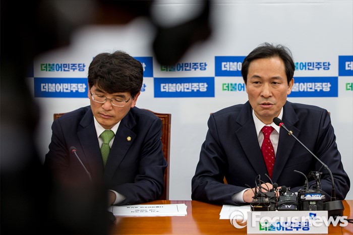 (서울=포커스뉴스) 우상호(오른쪽) 더불어민주당 원내대표가 9일 오전 서울 여의도 국회에서 열린 신임 원내대표단 회의에서 모두발언 하고 있다.