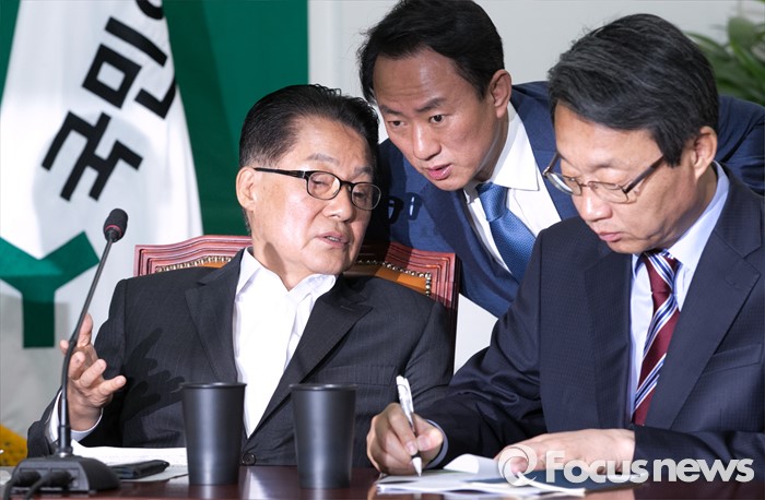 (서울=포커스뉴스) 박지원(왼쪽부터) 국민의당 원내대표, 김명진 원내대표비서실장, 김성식 정책위의장이 9일 오전 서울 여의도 국회에서 열린 최고위원회의에 참석해 대화하고 있다.