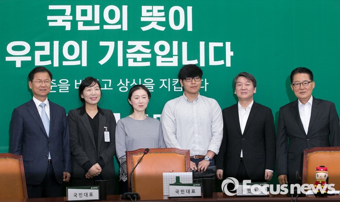 (서울=포커스뉴스) 9일 오전 서울 여의도 국회에서 열린 국민의당 최고위원회의에 참석한 지도부와 국민대표들이 취재진을 향해 포즈를 취하고 있다. 왼쪽부터 천정배 공동대표, 계윤정 소방교, 이윤정 소방경, 이규동 파이어마커스 대표, 안철수 상임공동대표, 박지원 원내대표.