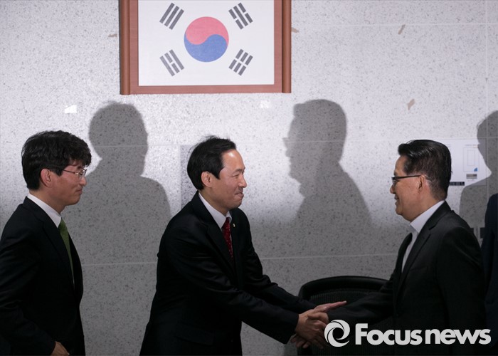 (서울=포커스뉴스) 우상호 더불어민주당 원내대표가 9일 오전 서울 여의도 국회 의원회관에서 박지원 국민의당 원내대표를 예방, 취재진을 향해 포즈를 취하고 있다. 왼쪽부터 박완주 더불어민주당 원내수석부대표, 우상호 원내대표, 박지원 국민의당 원내대표.