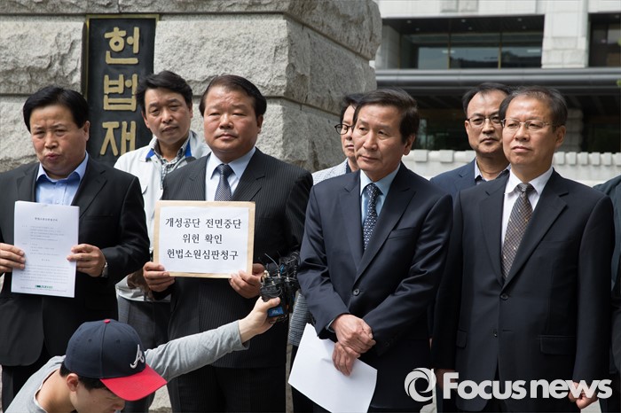 (서울=포커스뉴스) 9일 오전 서울 종로구 헌법재판소 앞에서 정기섭 개성공단기업협회 회장과 개성공단 비상대책위원회 관계자들이 정부의 개성공단 전면중단 조치에 대한 위헌심판 청구서 제출에 앞서 기자회견을 하고 있다.