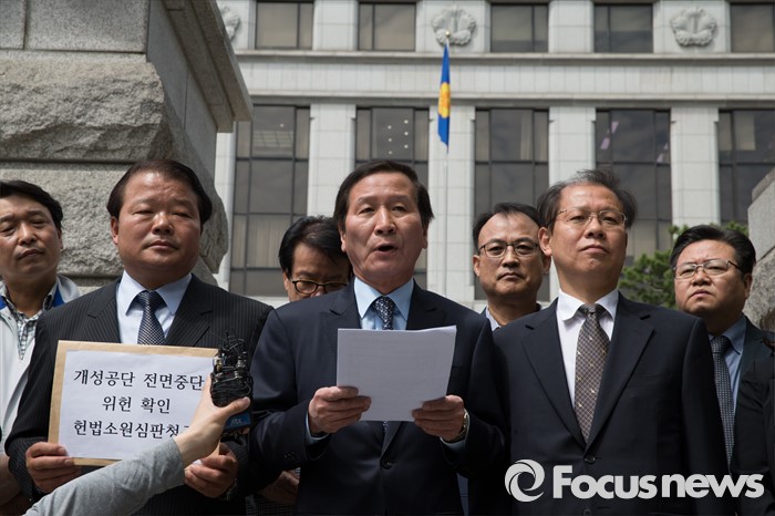 (서울=포커스뉴스) 9일 오전 서울 종로구 헌법재판소 앞에서 정기섭(가운데) 개성공단기업협회 회장과 개성공단 비상대책위원회 관계자들이 정부의 개성공단 전면중단 조치에 대한 위헌심판 청구서 제출에 앞서 기자회견을 하고 있다.