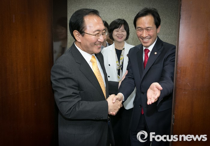 (서울=포커스뉴스) 우상호(오른쪽) 더불어민주당 원내대표가 9일 오전 서울 여의도 국회에서 노회찬 정의당 원내대표를 예방, 인사하고 있다.
