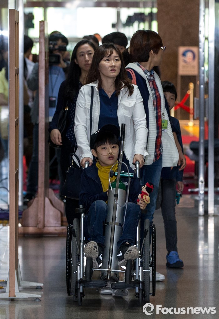 (서울=포커스뉴스) 가습기살균제 피해 가족 및 피해자들이 9일 오전 서울 여의도 국회에서 열린 '더불어민주당, 가습기살균제 대책특위 1차회의'에 참석하기 위해 회의실로 들어서고 있다.