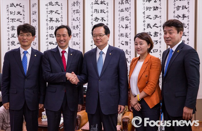 (서울=포커스뉴스) 정의화(왼쪽 세 번째) 국회의장과 우상호(왼쪽 두 번째) 더불어민주당 원내대표가 9일 오전 서울 여의도 국회에서 면담에 앞서 악수 하고 있다.