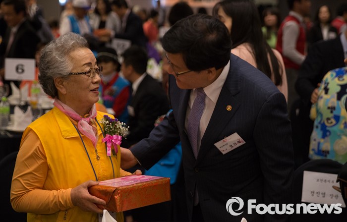 (서울=포커스뉴스) 9일 오전 서울 종로구 세종문화회관에서 열린 '2016 어버이날 孝 사랑 큰잔치' 에 참석한 정진엽 보건복지부 장관이 한 어르신께 선물을 전달하고 있다.