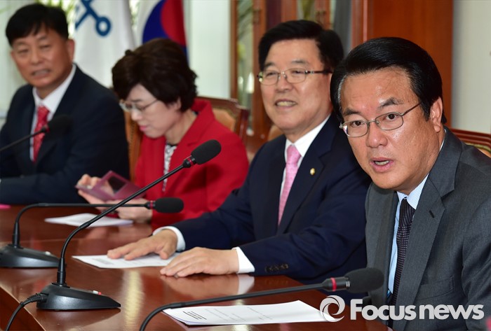 (서울=포커스뉴스) 정진석(오른쪽 첫번째) 새누리당 원내대표가 9일 오전 서울 여의도 국회에서 열린 신임 원내대표단과의 티타임에 참석해 모두발언을 하고 있다.