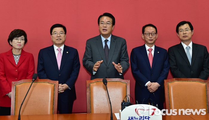 (서울=포커스뉴스) 정진석(왼쪽 세번째) 새누리당 원내대표가 9일 오전 서울 여의도 국회에서 신임 원내대표단과의 티타임에 앞서 모두발언을 하고 있다.