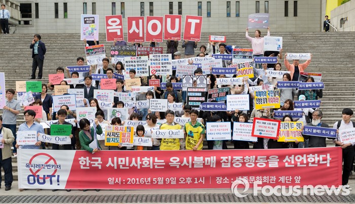 (서울=포커스뉴스) 9일 오후 서울 종로구 세종문화회관 앞 계단에서 환경운동연합 및 시민사회단체들이 옥시 불매 집중 행동 돌입선언 기자회견을 하고 있다.