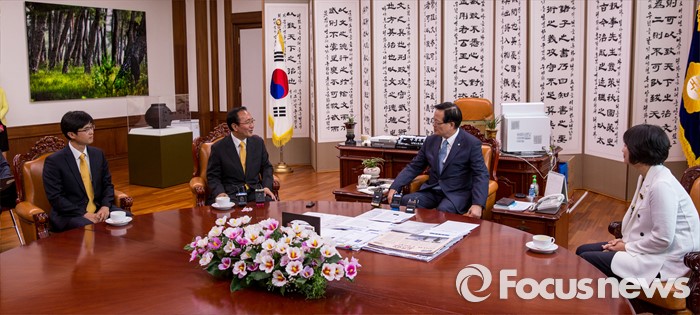 (서울=포커스뉴스) 정의화(오른쪽 두 번째) 국회의장이 9일 오후 서울 여의도 국회에서 노회찬 정의당 원내대표를 비롯한 신임 원내대표단과 면담 하고 있다.
