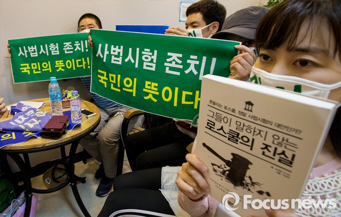 (서울=포커스뉴스) 9일 오후 서울 마포구 국민의당 당사에서 '사법시험존치를 위한 고시생 모임' 소속 학생들이 안철수 상임공동대표를 기다리고 있다. '사법시험존치를 위한 고시생 모임'에서 활동하는 수험생 6명은 이날 오전 국민의당 당사 회의실을 점거, 기자회견을 열고 안 대표와의 면담을 요청했다.