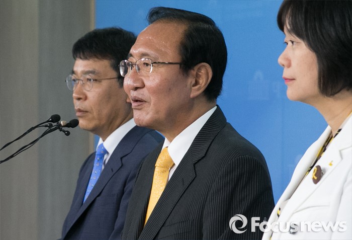 (서울=포커스뉴스) 노회찬 정의당 원내대표가 9일 오후 서울 여의도 국회 정론관에서 원내 당직 인선 발표 기자회견을 하고 있다. 왼쪽부터 원내대변인으로 임명된 김종대 비례대표 당선인, 노 원내대표, 원내수석부대표로 임명된 이정미 비례대표 당선인.