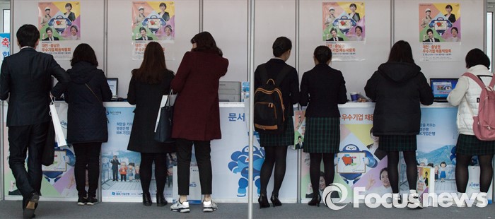 금융권 관계자는 "보험업권이 지난해 거둔 순이익은 6조3000억원으로 은행들을 앞질렀지만 일자리 늘리기엔 인색한 모습을 보였다"며 "은행에 비해 상대적으로 구조조정 요인이 적은 보험사들이 너무 몸을 사리는 것 같다"고 지적했다.(대전=포커스뉴스) 3월14일 오전 대전시청에서 열린 청년희망로드쇼 대전·충남권 우수기업 채용박람회에서 구직자들이 이력서를 작성하고 있다. 김기태 기자