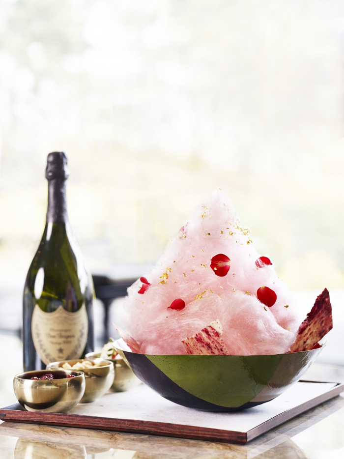 여기에 샴페인의 대명사인 2005년 산 돔 페리뇽(Dom Perignon)이 곁들어지며 구름모양의 솜사탕, 식용 장미 잎 그리고 금박 장식되는 세계 유일의 샴페인 빙수다. 가격은 2인 기준 8만원(세금 및 봉사료 포함)이며 돔 페리뇽 샴페인 1잔이 포함된다.