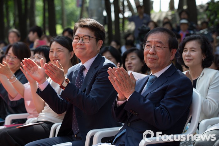 (서울=포커스뉴스) 9일 오후 서울 성동구 송정햇살어린이집에서 열린 서울시 1000번째 국공립어린이집 개원식에서 박원순(오른쪽) 서울시장과 정원오 성동구청장이 박수를 치고 있다.
