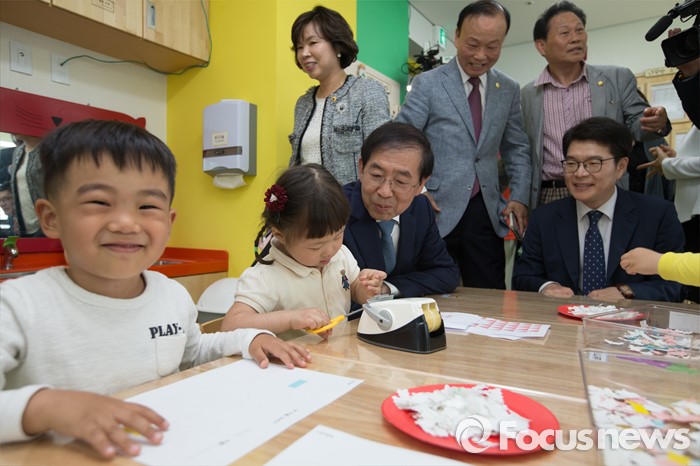 (서울=포커스뉴스) 박원순(오른쪽 두번째) 서울시장과 정원오 성동구청장이 9일 오후 서울 성동구 송정햇살어린이집에서 열린 서울시 1000번째 국공립어린이집 개원식을 마친 뒤 어린이들과 시간을 보내고 있다.