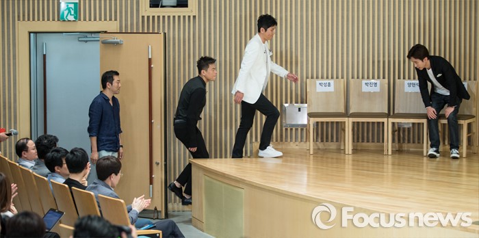 (서울=포커스뉴스) 9일 오후 서울 양천구 SBS 목동사옥에서 열린 '서바이벌 오디션 K팝스타 시즌6' 제작발표회에 참석한 박성훈(왼쪽부터)PD와 심사위원 박진영, 양현석, 유희열이 자리를 향해 이동하고 있다.