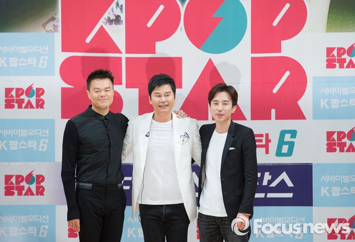 (서울=포커스뉴스) 9일 오후 서울 양천구 SBS 목동사옥에서 열린 '서바이벌 오디션 K팝스타 시즌6' 제작발표회에 참석한 심사위원 박진영(왼쪽부터), 양현석, 유희열이 포토타임을 갖고 있다.