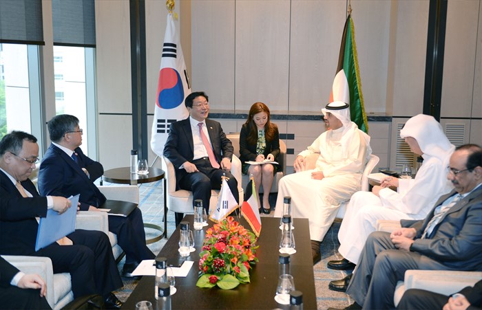 (서울=포커스뉴스) 주형환 산업통상자원부 장관이 9일 오후 서울 종로구 광화문 포시즌호텔에서 아나스 칼레드 알 살레(H.E. Anas Khaled Al-Saleh) 쿠웨이트 석유부 장관(부총리, 재무장관, 석유부장관 직무대리)의 예방을 받고, 한-쿠웨이트 양국간 에너지 분야를 비롯해서 주력산업, 신산업 분야 등 산업전반에 걸친 구체적인 협력방안을 논의하고 있다. <사진제공=산업통상자원부>