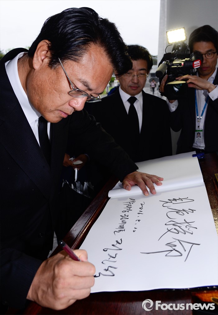 (서울=포커스뉴스) 10일 오전 서울 동작구 국립현충원을 찾은 정진석 새누리당 신임 원내대표가 참배 후 방명록을 작성하고 있다.