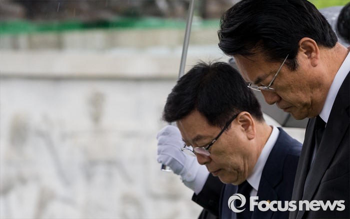 (서울=포커스뉴스) 10일 오전 서울 동작구 국립현충원을 찾은 정진석(오른쪽) 새누리당 신임 원내대표와 김광림 신임 정책위의장이 묵념하고 있다.