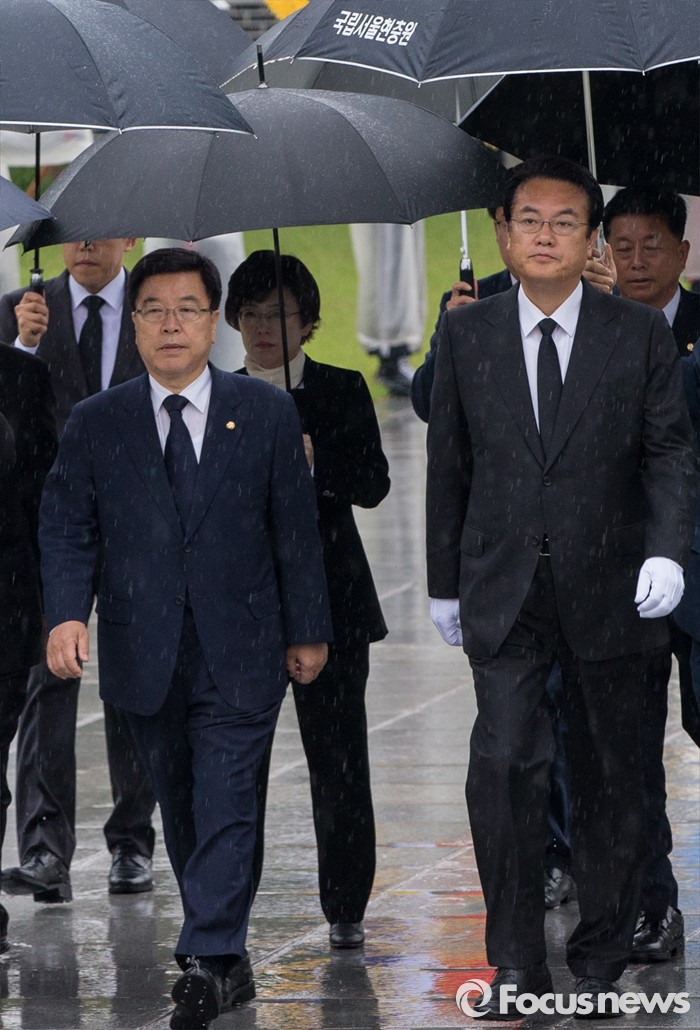 (서울=포커스뉴스) 10일 오전 서울 동작구 국립현충원을 찾은 정진석(맨 오른쪽) 새누리당 신임 원내대표와 김광림 신임 정책위의장이 분향단으로 발걸음을 옮기고 있다.
