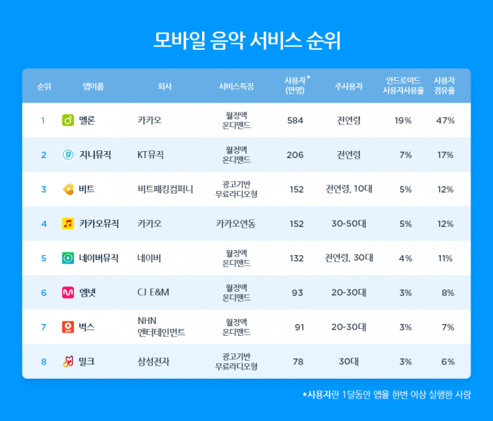 10일 모바일 애플리케이션(앱) 사용 분석 서비스 업체 와이즈앱에 따르면 지난 4월 한달간 안드로이드 스마트폰 앱 가운데 월간 사용자수 기준으로 음악앱은 카카오가 인수한 '멜론'이 584만명으로 1위를 기록했다. 2위는 KT뮤직의 '지니'로 206만명이 이용했으며 3위는 152만명이 사용한 무료 음악 서비스 '비트'가 차지했다. 그 뒤로는 '카카오뮤직', '네이버뮤직', '엠넷', '벅스', '밀크' 순이었다.