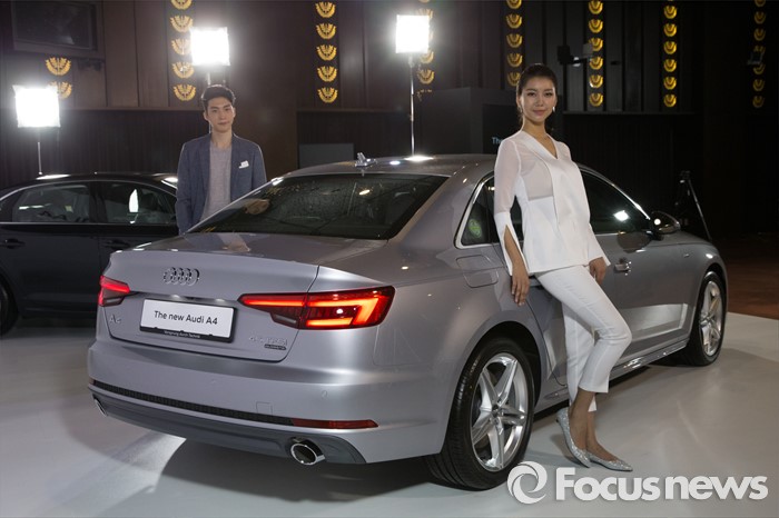 (서울=포커스뉴스) 10일 오전 서울 중구 반얀트리 클럽 앤 스파에서 모델들이 준중형 세단 '뉴 아우디 A4'를 선보이고 있다. '뉴 아우디 A4'는 기존 모델보다 무게가 최대 100kg까지 감량, 최고 출력 252마력, 최대 토크 38.0kg·m, 연비는 복합연비 기준 11.6km이다.