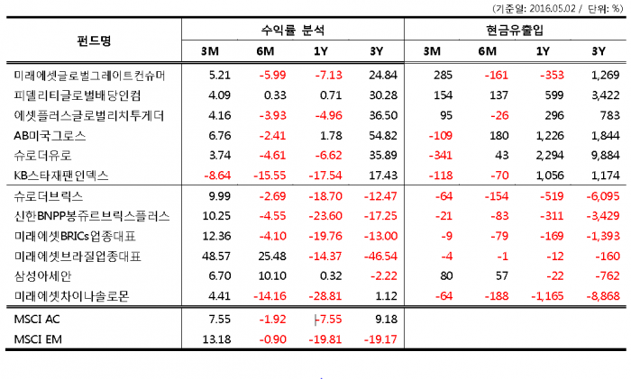 브라질 등 자원국 펀드는 지난 3년간 30%이상 손실을 기록하다 최근 대부분 만회했다. 반면 인도네시아, 싱가포르 등 아세안성장국가에 투자한 펀드는 안정적인 수익률을 보였다.