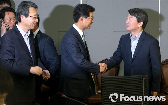 (서울=포커스뉴스) 안철수(오른쪽) 국민의당 상임공동대표와 천정배(가운데) 공동대표가 10일 오전 서울 여의도 국회 의원회관에서 열린 당선자 총회 및 3차 집중워크숍에 참석해 인사하고 있다. 왼쪽은 김성식 정책위의장.