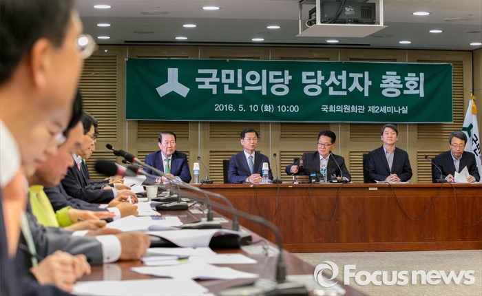 (서울=포커스뉴스) 박지원(오른쪽 세번째) 국민의당 원내대표가 10일 오전 서울 여의도 국회 의원회관에서 열린 당선자 총회 및 3차 집중워크숍에 참석해 개의 선언을 하고 있다.