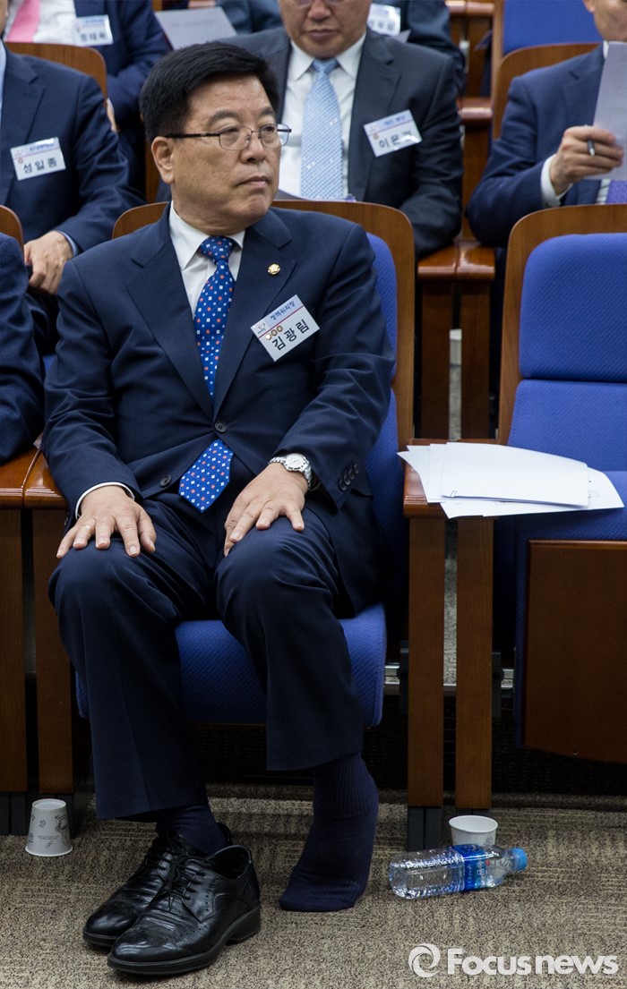 (서울=포커스뉴스) 10일 오전 서울 여의도 국회에서 열린 새누리당 제20대 국회 초선의원 연찬회에 참석한 김광림 신임 정책위의장이 구두를 벗은 후 발목을 풀고 있다.