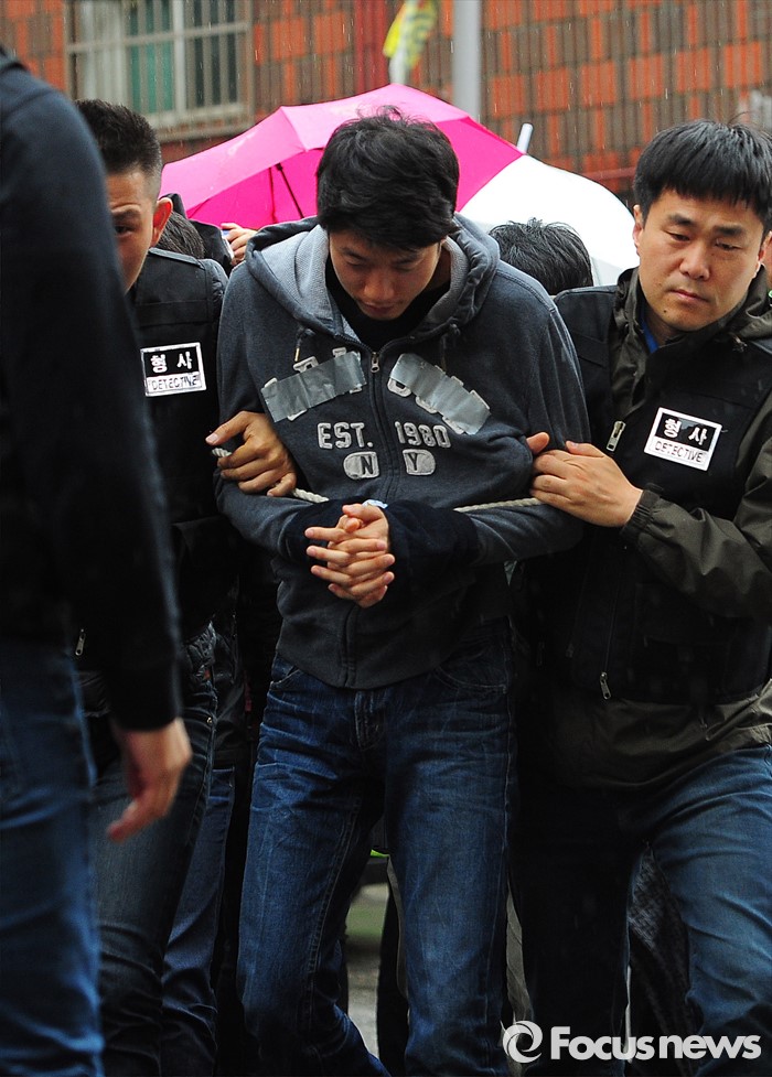 오전 9시 30분 경찰 호승차에서 내린 조씨는 검거 당시와 같은 회색 후드점퍼와 청바지 차림으로 포승줄에 묶인 상태였다.