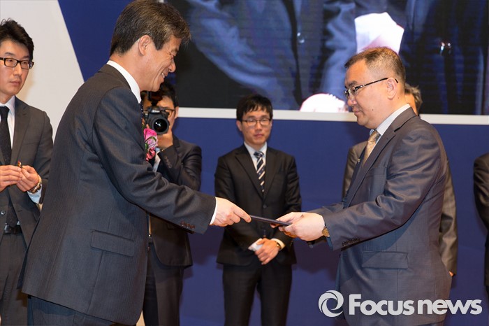 (과천=포커스뉴스) 10일 오전 경기도 과천시민회관에서 열린 '제5회 유권자의 날 기념식'에서 이인복(왼쪽) 중앙선거관리위원장이 손병권 중앙대학교 교수에게 대통령표창을 전달하고 있다.