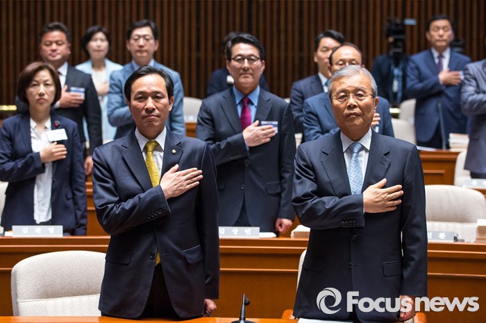 | △ 국민의례하는 김종인 대표-우상호 원내대표 |