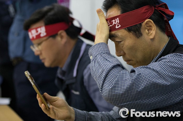 (서울=포커스뉴스) 10일 오전 서울 영등포구 한국노총회관에서 열린 '양대노총 공공부문 공대위 기자회견'에 참석한 공공운수 노조 조상수 공동위원장이 머리띠를 확인하고 있다.