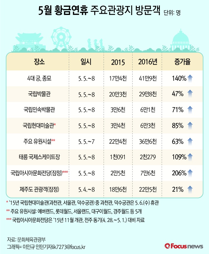 (서울=포커스 뉴스) 문화체육관광부에 따르면 지난 5월6일 임시공휴일을 포함한 연휴기간이었던 5일부터 8일까지 나흘간 주요 관광지 관람객이 큰 폭으로 증가하는 등 국내여행이 증가한 것으로 나타났다.