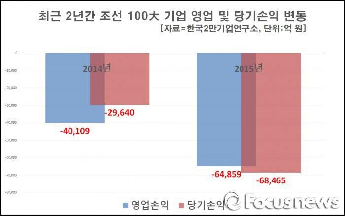 조선 100대 기업은 당기손익도 큰 폭의 손실을 봤다. 2014년 2조9640억원의 당기손실에 이어 지난해 6조8456억원으로 더욱 악화됐다. 기업수로는 33곳이 당기손실을 기록했다.