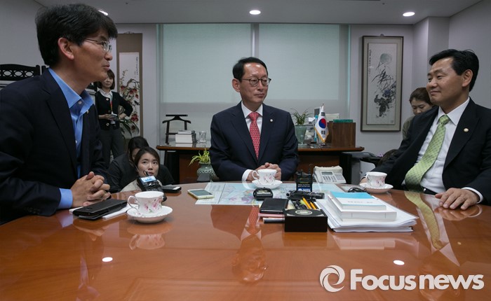 (서울=포커스뉴스) 김도읍(가운데) 새누리당 원내수석부대표, 박완주(왼쪽) 더불어민주당 원내수석부대표, 김관영 국민의당 원내수석부대표가 10일 오후 서울 여의도 국회 의원회관에서 박근혜 대통령과 여야 신임 원내지도부 회동 의제 조율을 위한 논의를 하고 있다.